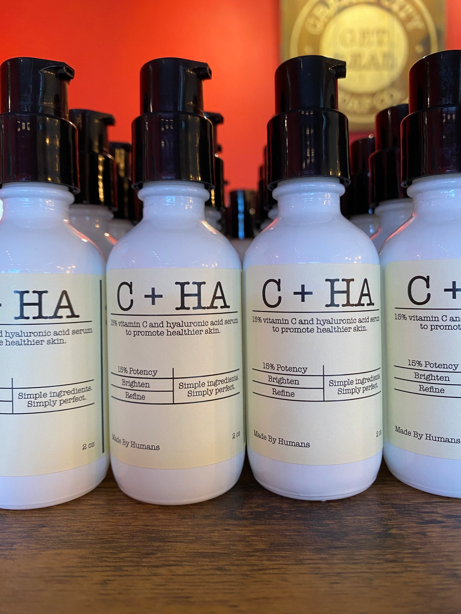 Our C + HA serum is finally launched! This vitamin C and hyaluronic acid serum will keep your skin feeling hydrated and healthy. The benefits of vitamin C are too numerous to list here. To use, dispense one pump to your palm, apply it over your face, and follow it up with our lotion to make it most effective. This potent little bottle will get you about 220 uses, costing you only 19¢ per application.